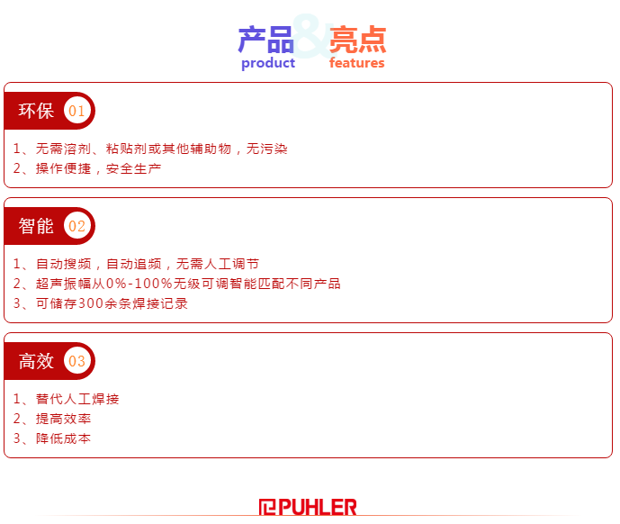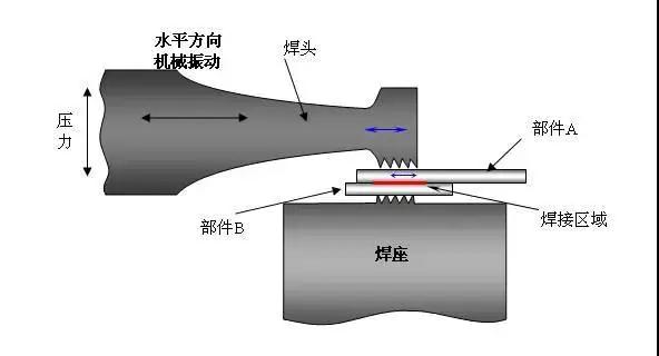 超声波焊接是利用高频振动波传递到两个需焊接的物体表面,在加压的情况下,使两个物体表面相互摩擦而形成分子层之间的熔合。