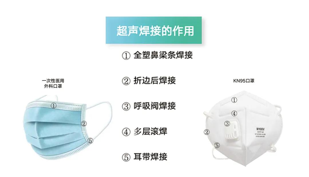 在口罩的生产过程中,我们能直观的了解全塑鼻梁条焊接、折边后焊接、呼吸阀焊接、多层滚焊、耳带焊接,这些其实都是通过超声焊接工艺来完成的。