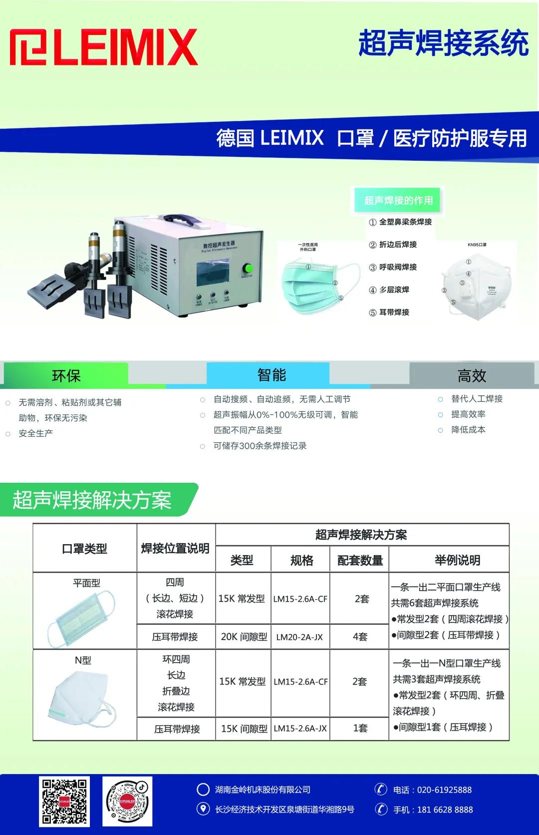 德国LEIMIX在超声高速制备行业有着多年的生产经验以及深厚的技术支撑,在全球共同体下,面临着这一次疫情的来势汹汹,德国LEIMIX看到了全球口罩的紧缺供应,更是看到了口罩生产中必需的焊接工艺,是务必严控把关才能更好地保证口罩的生产,才能确保口罩的供应。